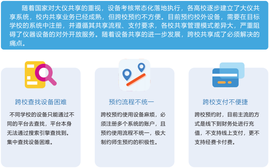 缺少一個(gè)信息集中的、權威的管理與交流平臺,有限的儀器設備資源信息得不到充分的交流,傳統共享管理方式不能支撐日常設備預約使用的需求,存在設備閑置的情況;另一方面由于大精儀器設備價(jià)值高,很多經(jīng)費不足的科研單位以及社會(huì )上的初創(chuàng )的研發(fā)型企業(yè)想用但沒(méi)有資源。
